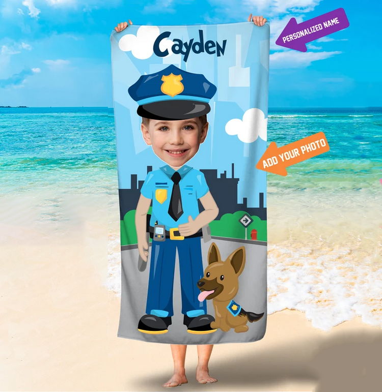 Policeman Photo Towels, Kids Personalized Photo Face Beach Towel, Custom Photo Face Towels, Police Beach Towels, Boys Towel