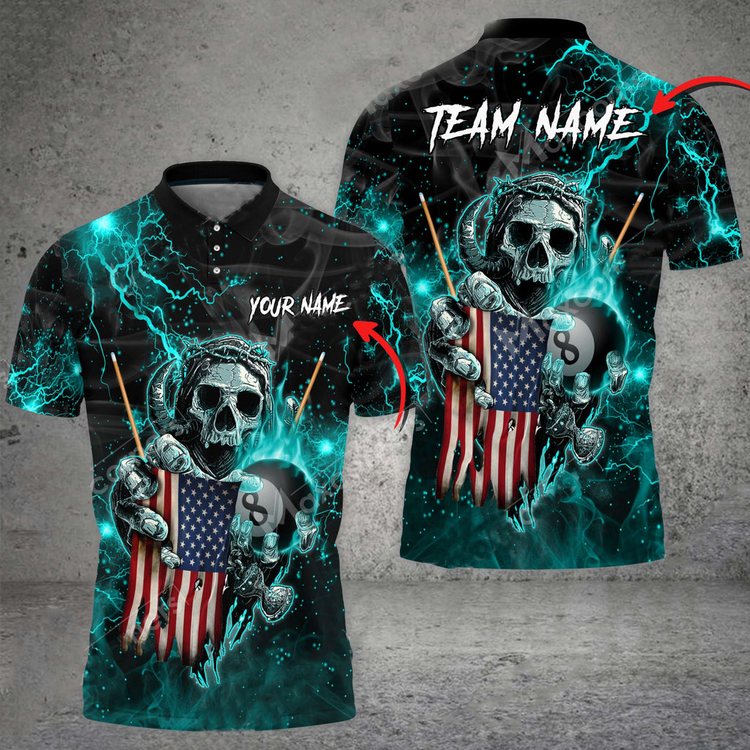 Billiards Fire Skull US Flag Personalized Name, Team Name 3D Polo Shirt, Flag Billiard Shirt