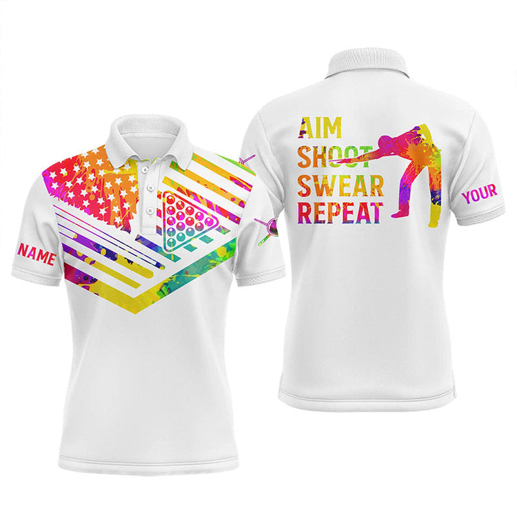 Home Billiard Billiards Polo Shirts For Men Watercolor American Flag Custom Name Aim Shoot Swear Repeat