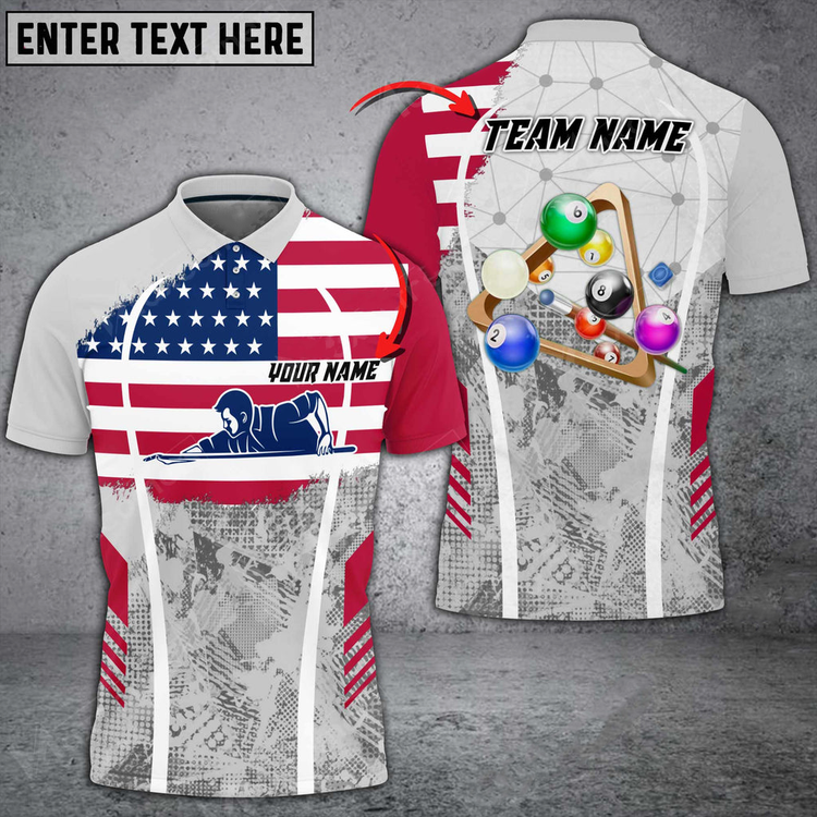 Coolspod Billiards Grunge White US Flag Personalized Name 3D Polo Shirt, Gift for Pooler