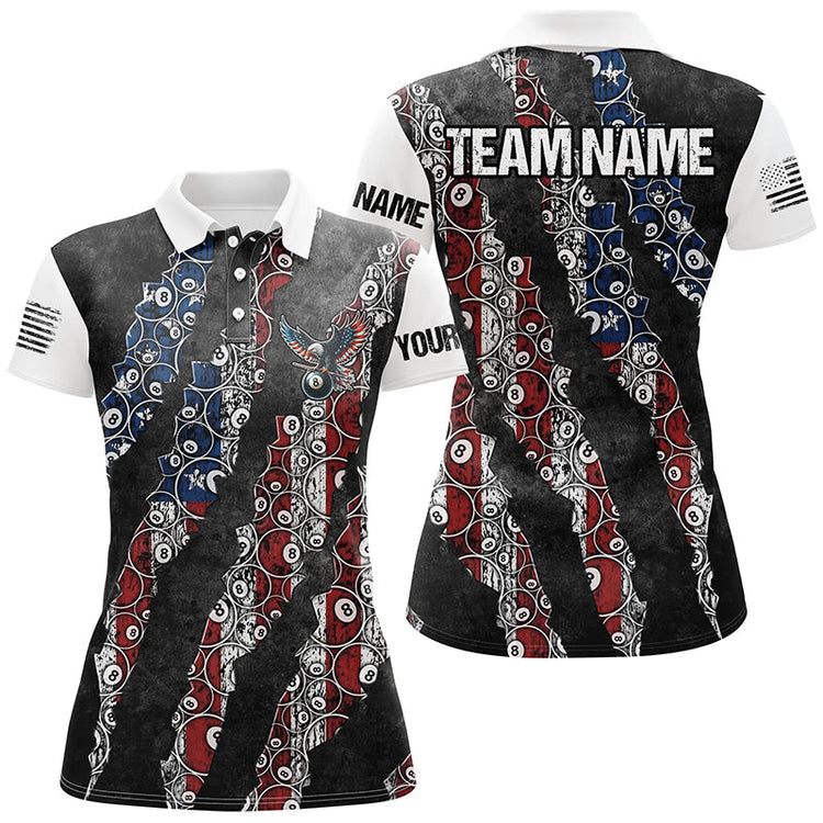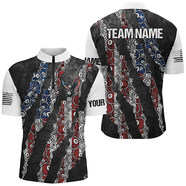 Grunge American Flag 8 Ball Pattern Custom Billiard Polo Shirts, Patriotic Billiard Jerseys