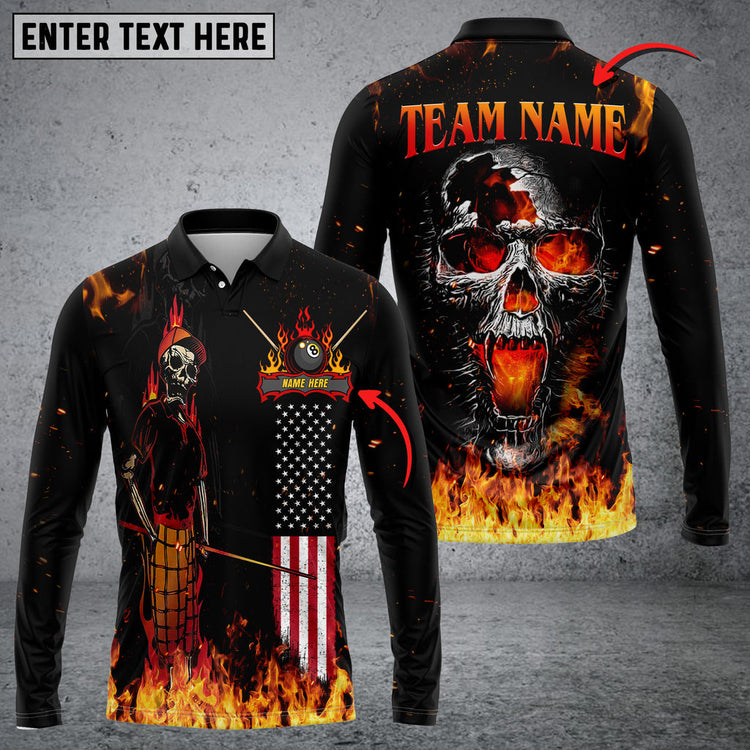 Personalized Name Billiards Master Long Sleeve Polo Excellence, Skull Fire Billiard Polo Shirt