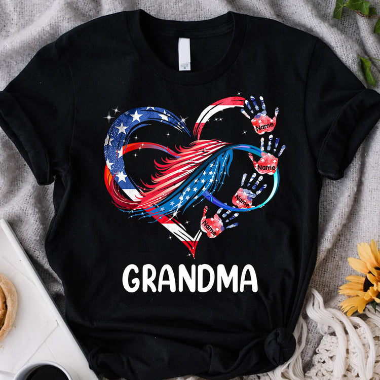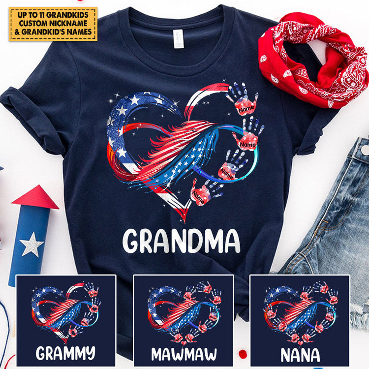 Personalized Grandma American Flag Pattern Heart With Handprints T-Shirt For Grandma