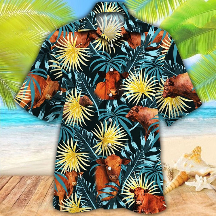 Red Angus Cattle Blue And Yellow Tropical Plants Hawaiian Shirt