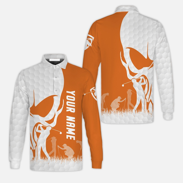 Custom Name Skull White Golf Ball, Orange Apparel Long Sleeve Shirt - Personalized Gift For Golf Lover