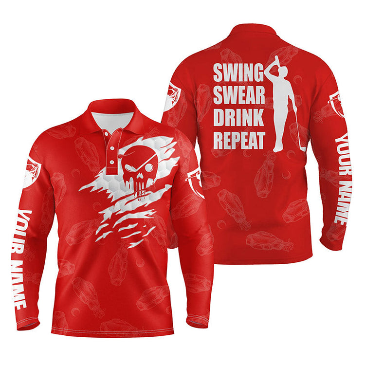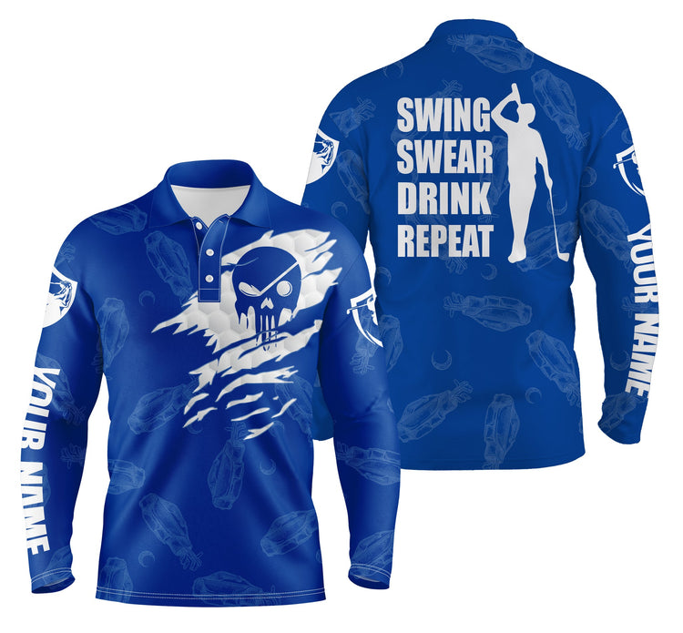 Mens Golf Long Sleeve Polo Shirt Swing Swear Drink Repeat Custom Name Black Golf Clubs Pattern Shirt