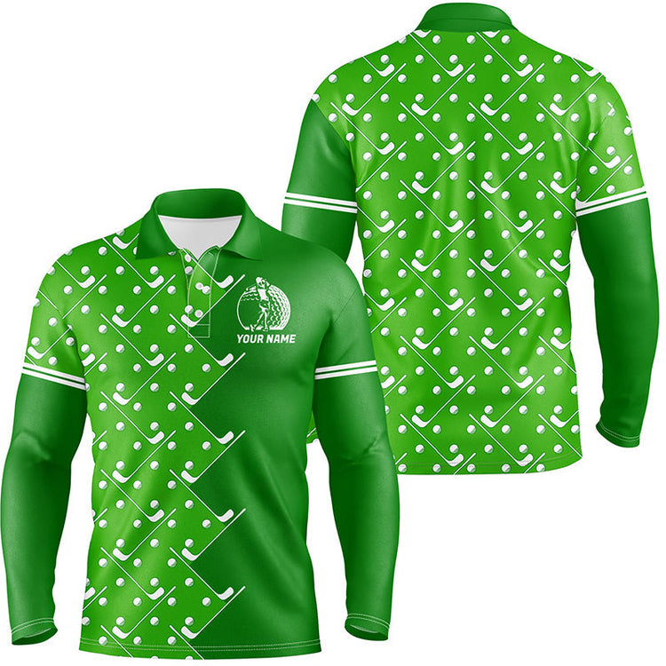 Mens Golf Long Sleeve Polo Shirts Custom Green Golf Pattern Men's Golf Clothing, Unique Golf Gifts