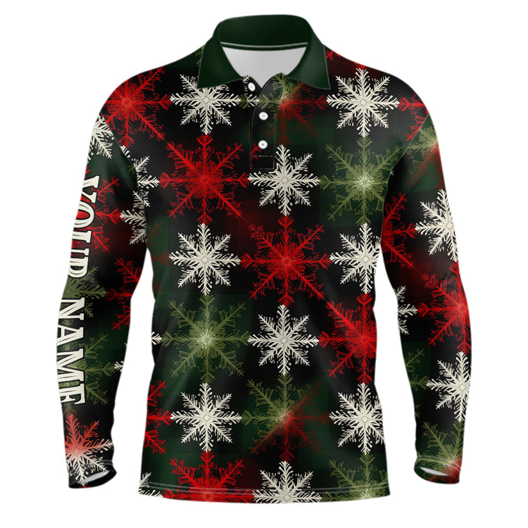 Mens Golf Polo Shirt Custom Red Green Christmas Snowflake Pattern, Mens Christmas Golf Shirts