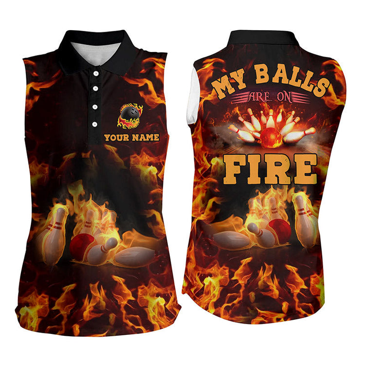 Flame Bowling Custom My Balls Are On Fire Bowling Sleeveless Polo Shirts For Women, Bowling Polo Shirt