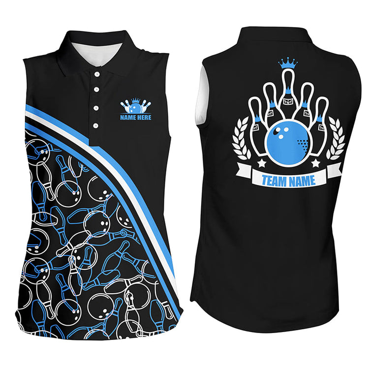 Personalized Bowling Sleeveless Polo Shirt Custom Name Black Blue Bowling Pattern, Bowling Team Shirts