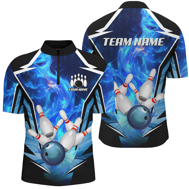 Blue Flame Bowling Ball and Pins Bowling Polo, Quarter Zip Shirts for Men Custom Bowling Team jersey