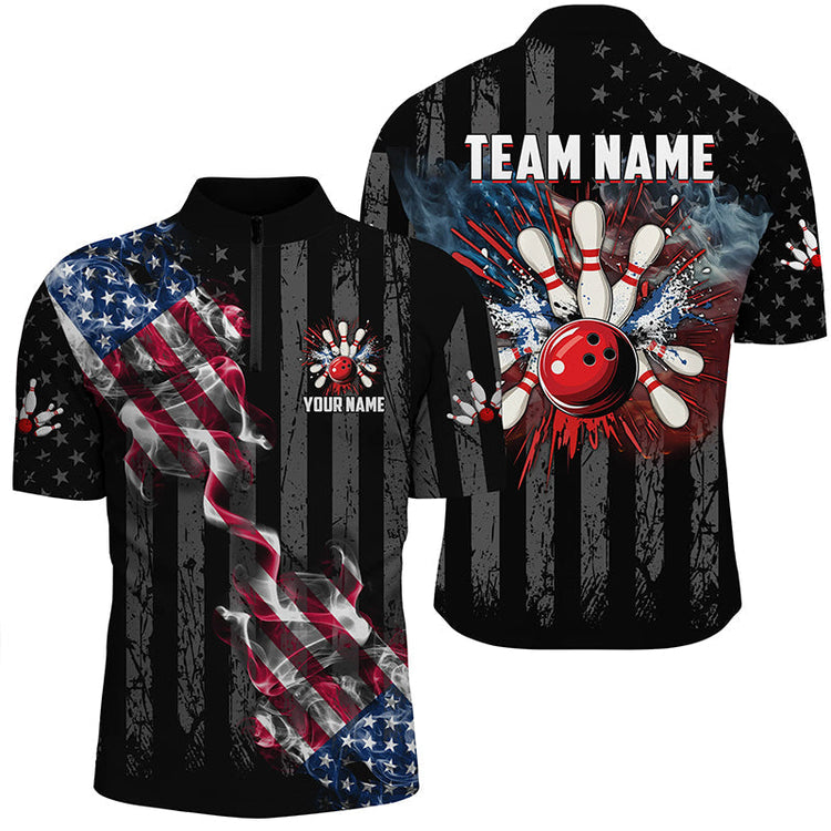 Bowling And Pins Black American Flag Smoke Customized Name, Team Name 3D Jersey Shirt For Men