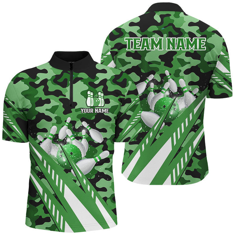 Custom Green Camo Bowling Shirts, Personalized Bowling Team Jerseys