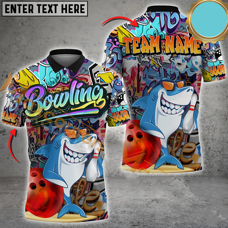 Graffiti-Style Shark Bowling Jersey Personalized Name, Team Name 3D Shirt