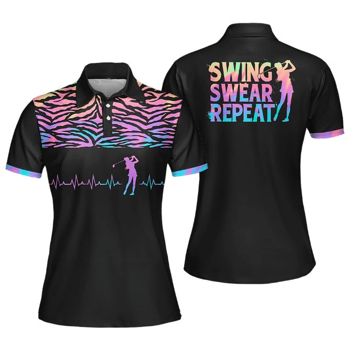 Golf Heart Beat Hologram Swing Swear Repeat Funny Polo Shirt For Woman, Women Golf Shirt