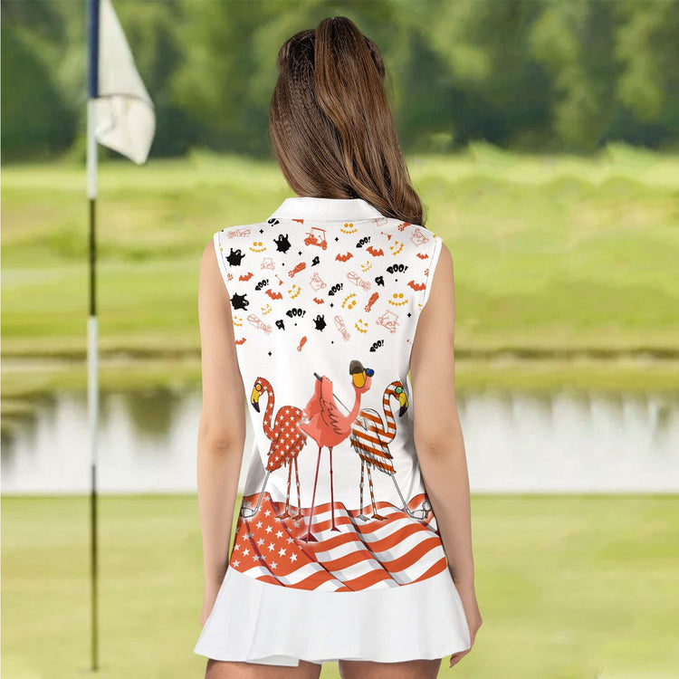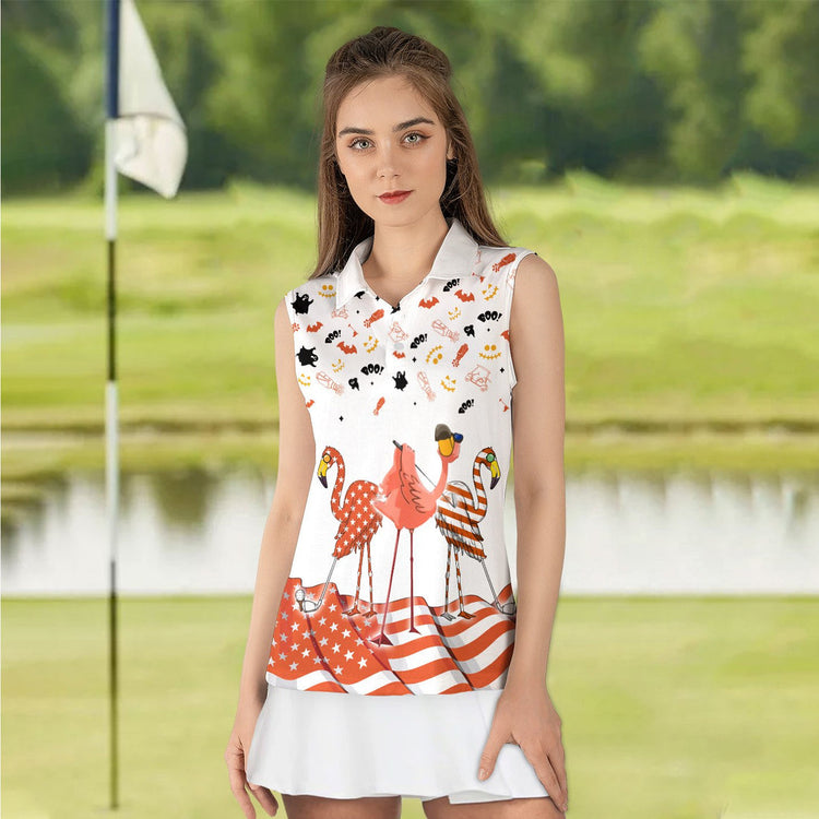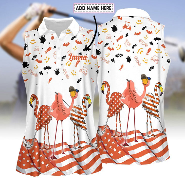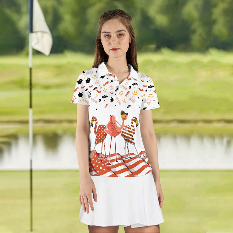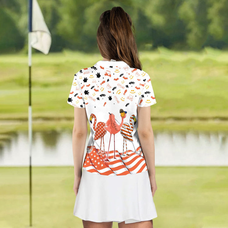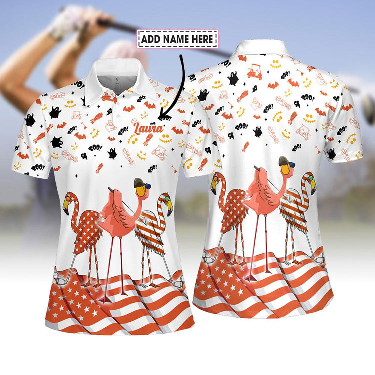 Personalized Name Halloween American Flag Flamingo Women Golf Polo Shirt