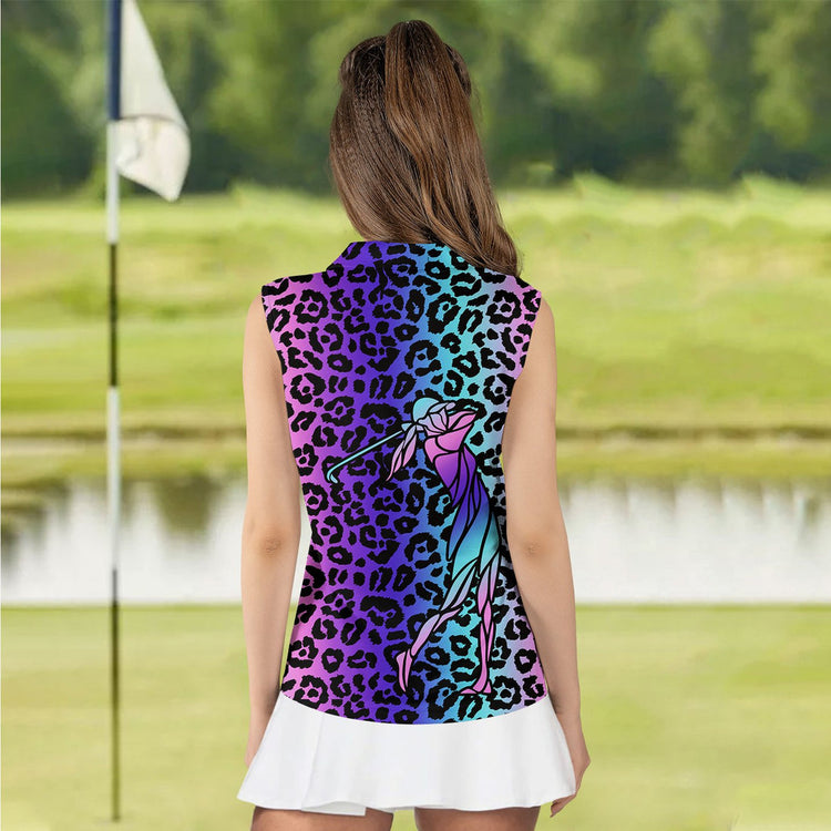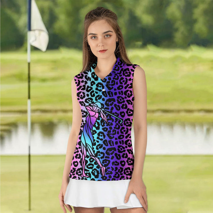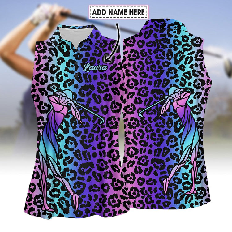 Home Womens Sleeveless Golf Shirts Personalized Name Leopard Gradient Color Golf Pattern Women Polo Shirt