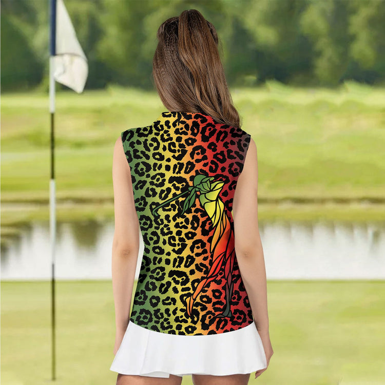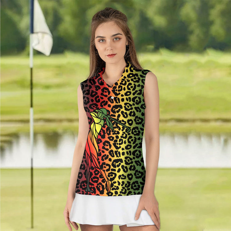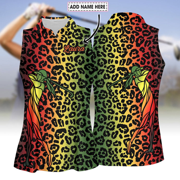 Home Womens Sleeveless Golf Shirts Personalized Name Leopard Gradient V2 Color Golf Pattern Women Polo Shirt