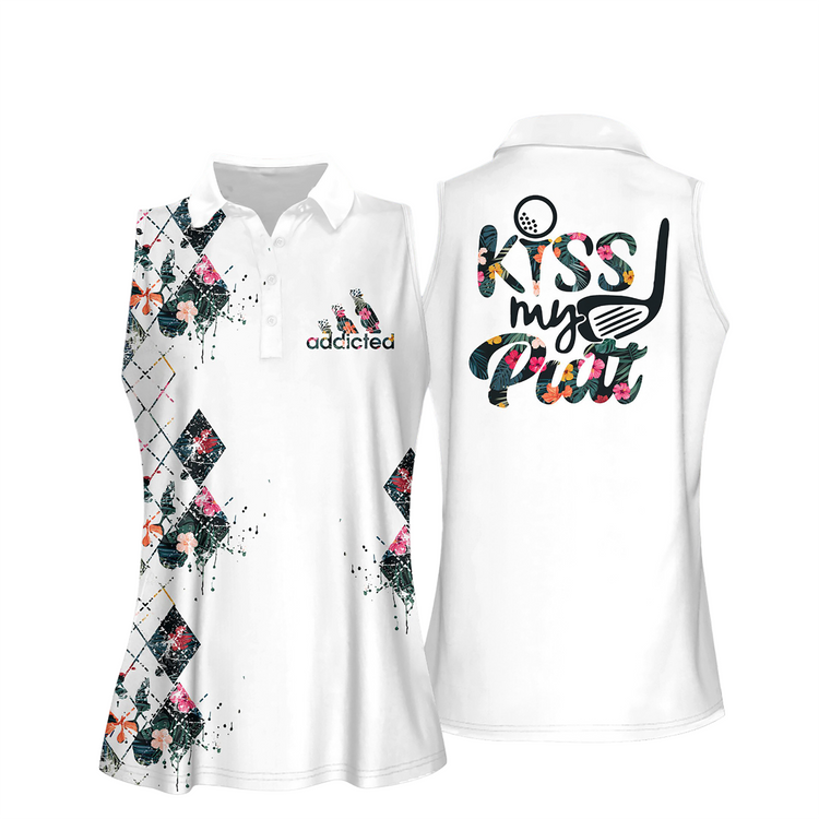 Home Womens Sleeveless Golf Shirts Tropical Flower Argyle Style Kiss My Putt Women Short Sleeve Polo Shirt, Sleeveless Golf Polo Shirt