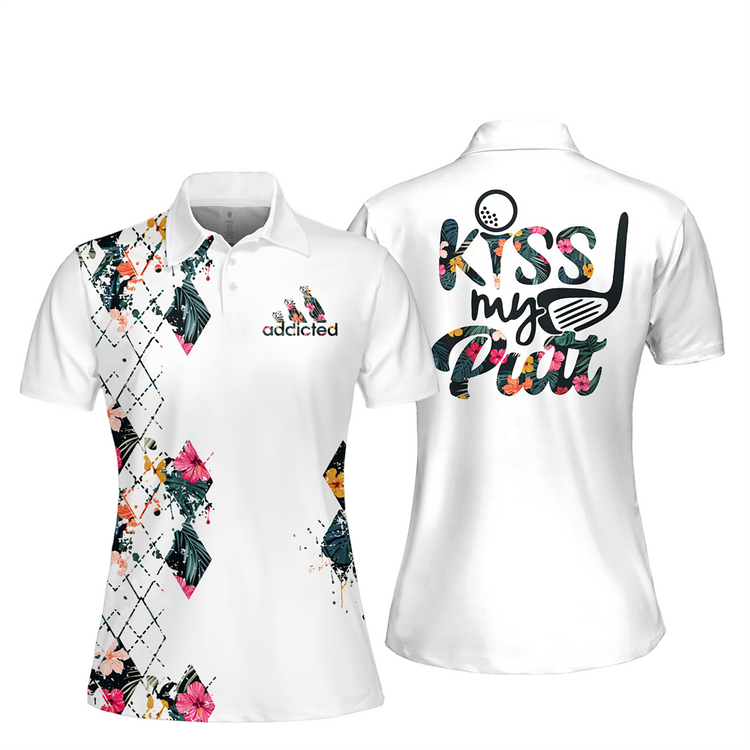 Tropical Flower Argyle Style Kiss My Putt Women Short Sleeve Polo Shirt, Sleeveless Golf Polo Shirt