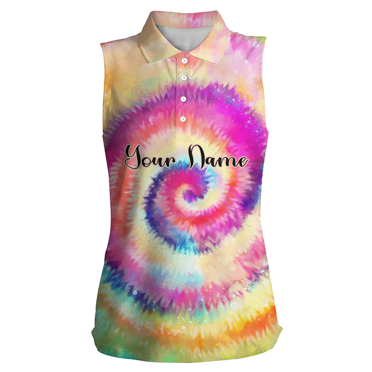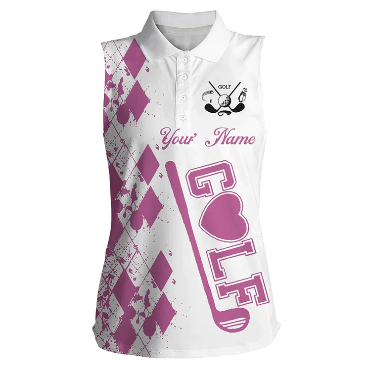 Women's sleeveless golf polo shirt, custom name pink golf clubs white golf shirt for women