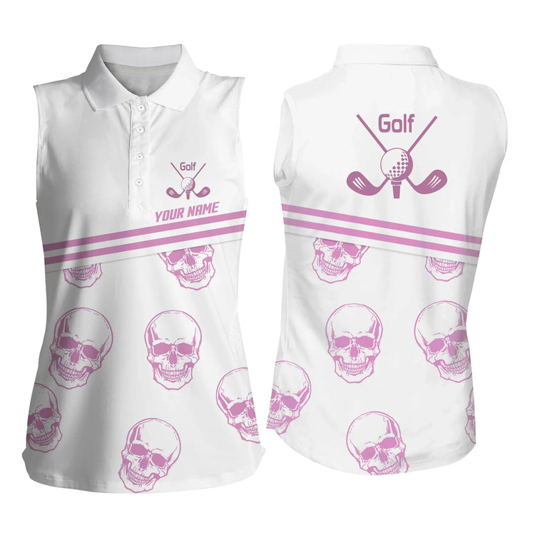 Home Womens Sleeveless Golf Shirts Women's sleeveless golf polo shirt, custom name pink golf clubs white golf shirt for women