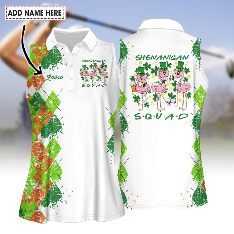 Home Women's Sleeveless Polo Shirt Personalized Name Argyle Shenanigan Squad Flamingo ST Patrick's Day Women Polo Shirt