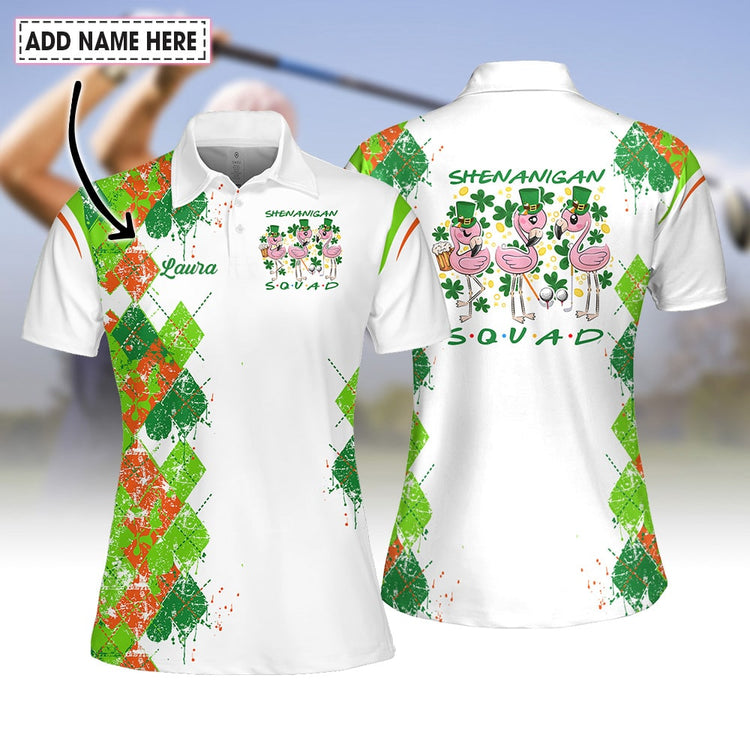 Personalized Name Argyle Shenanigan Squad Flamingo ST Patrick's Day Women Polo Shirt
