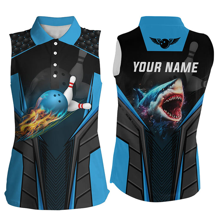 Personalized Bowling Shirt For Women Custom Shark Team Blue Bowling Ball Bowling Sleeveless Polo Shirt